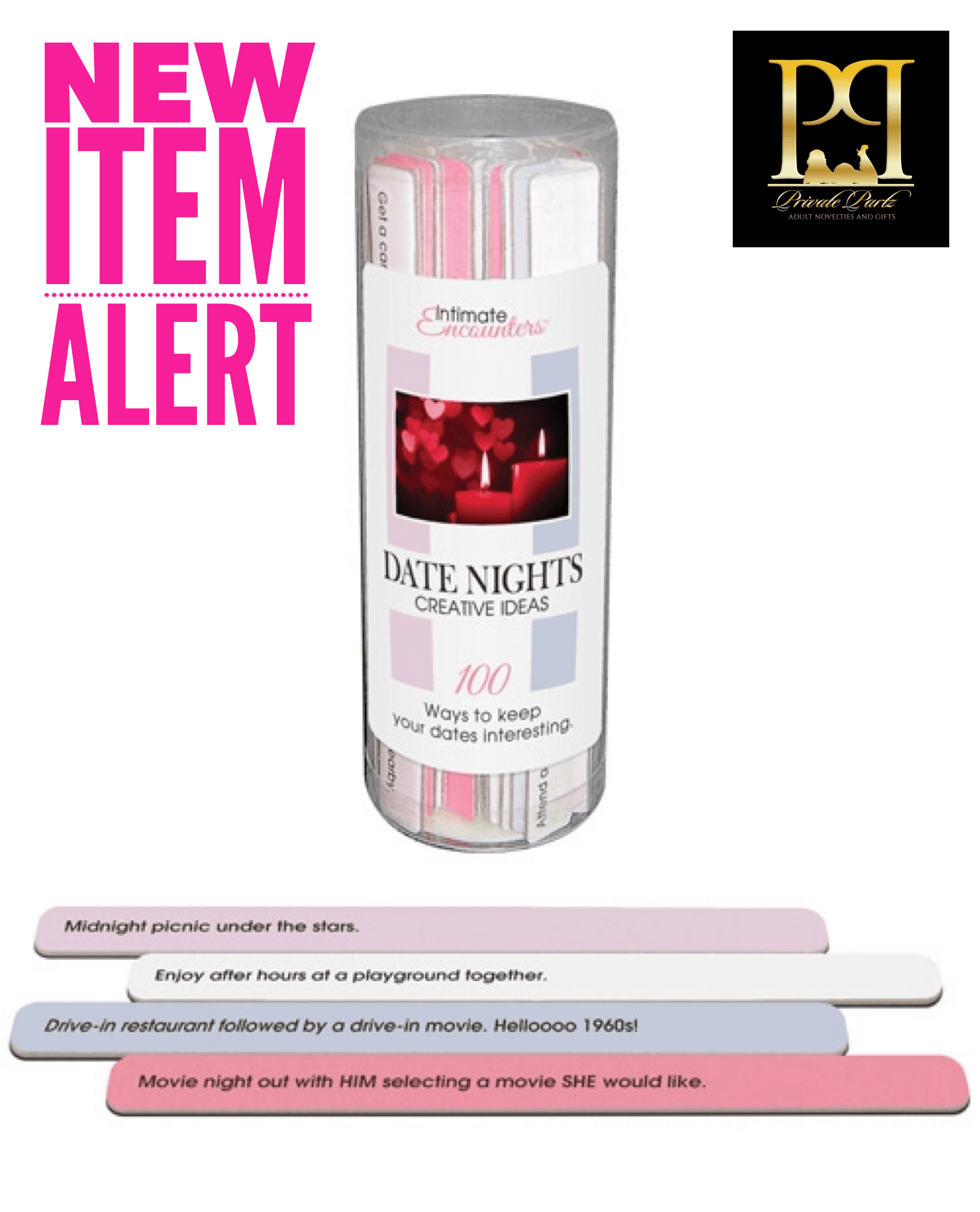 Intimate Encounters: Date Nights; Creative Ideas from Kheper Games. 100 ways to keep your dates interesting! Whenever you need a date night idea, select an idea stick. Read both sides of the stick with your significant other and choose the one you wish to carry out. Note: You may wish to display these sticks in a decorative bowl or on a plate. Includes: 50 sticks with 100 creative ideas. Language(s): English. Target Audience: Couples. Number of Players: 2.