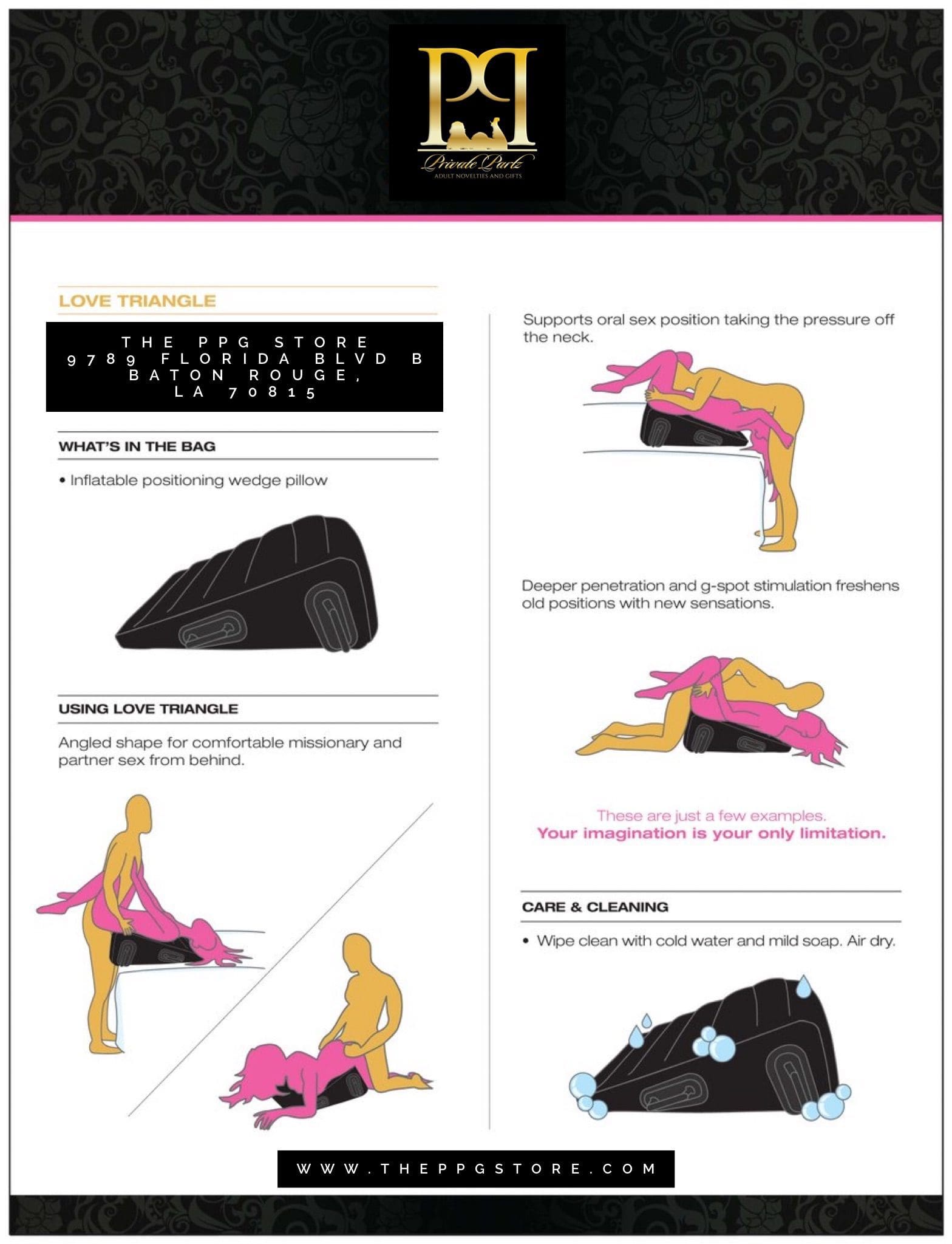 First of all it get you out of your normal bedroom setting. Second it gives great support because of the love handles on the side of the pillow. It gives great support so that you can get in multiple positions and it helps you to balance. Third it props you up just right so that the G Spot is hit every time.